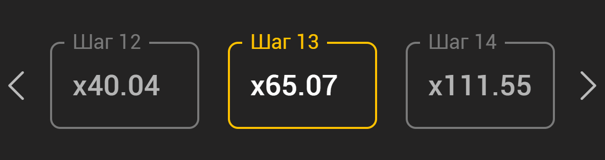 В зависимости от количества мин на поле, будут рассчитаны и отображены коэффициенты для каждого шага. Коэффициент, который соответствует текущему шагу, выделяется с помощью обводки.